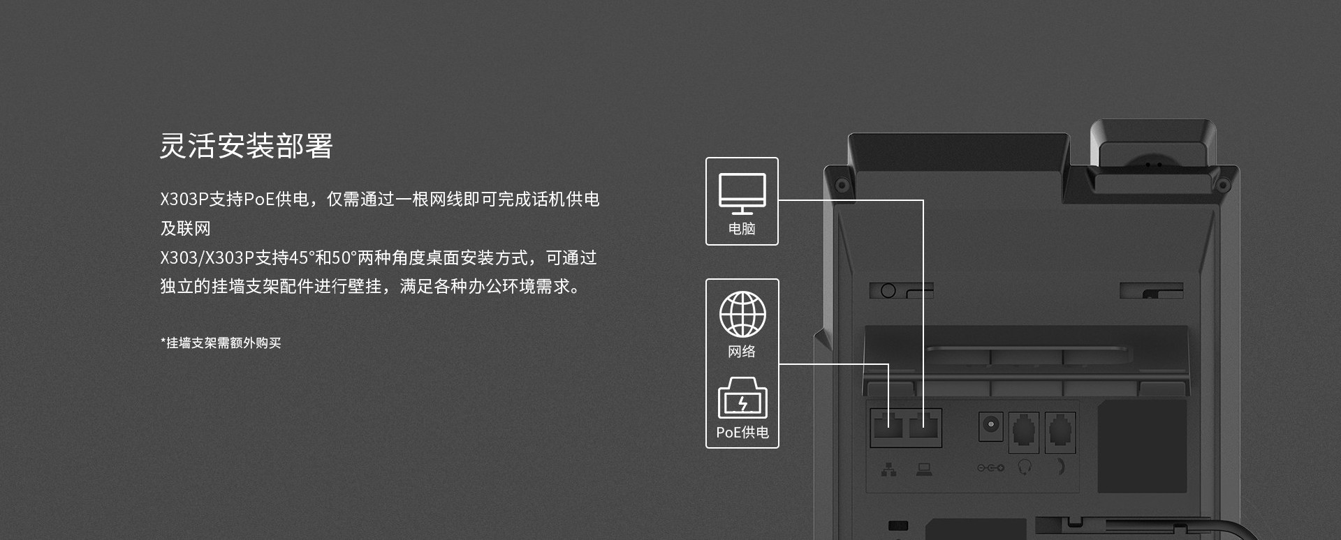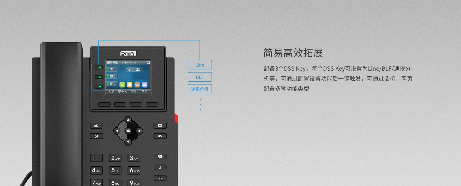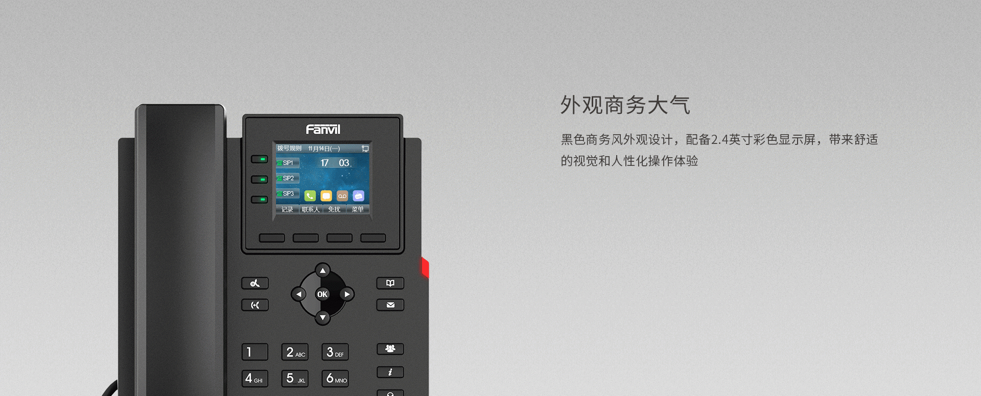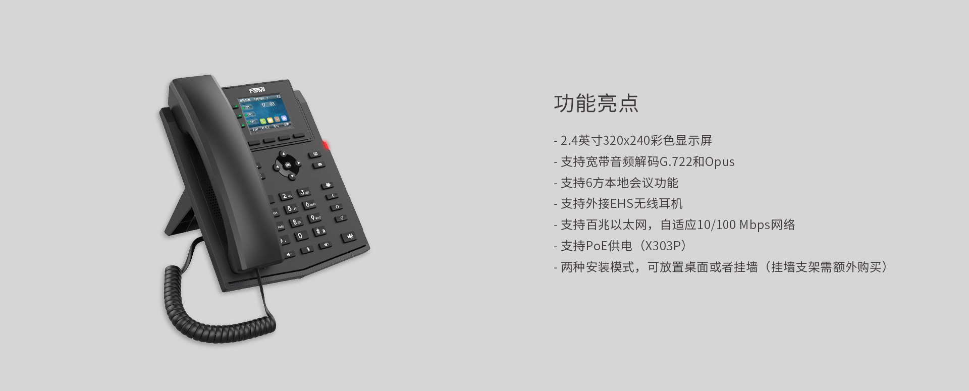 方位X303/X303P是一款功能强大、高性价比的企业级彩屏网络电话,配备2.4英寸320x240彩色显示屏,拥有4个SIP账号,支持PoE供电 (仅限X303P)、高清语音、六方电话会议等丰富功能;以及可外接EHS无线耳机等扩展功能;可满足不同的企业应用场景,并提供优质的用户体验。