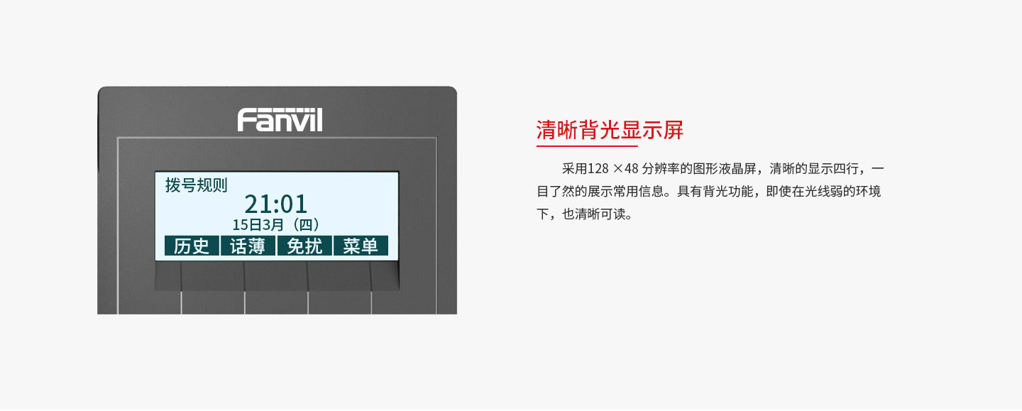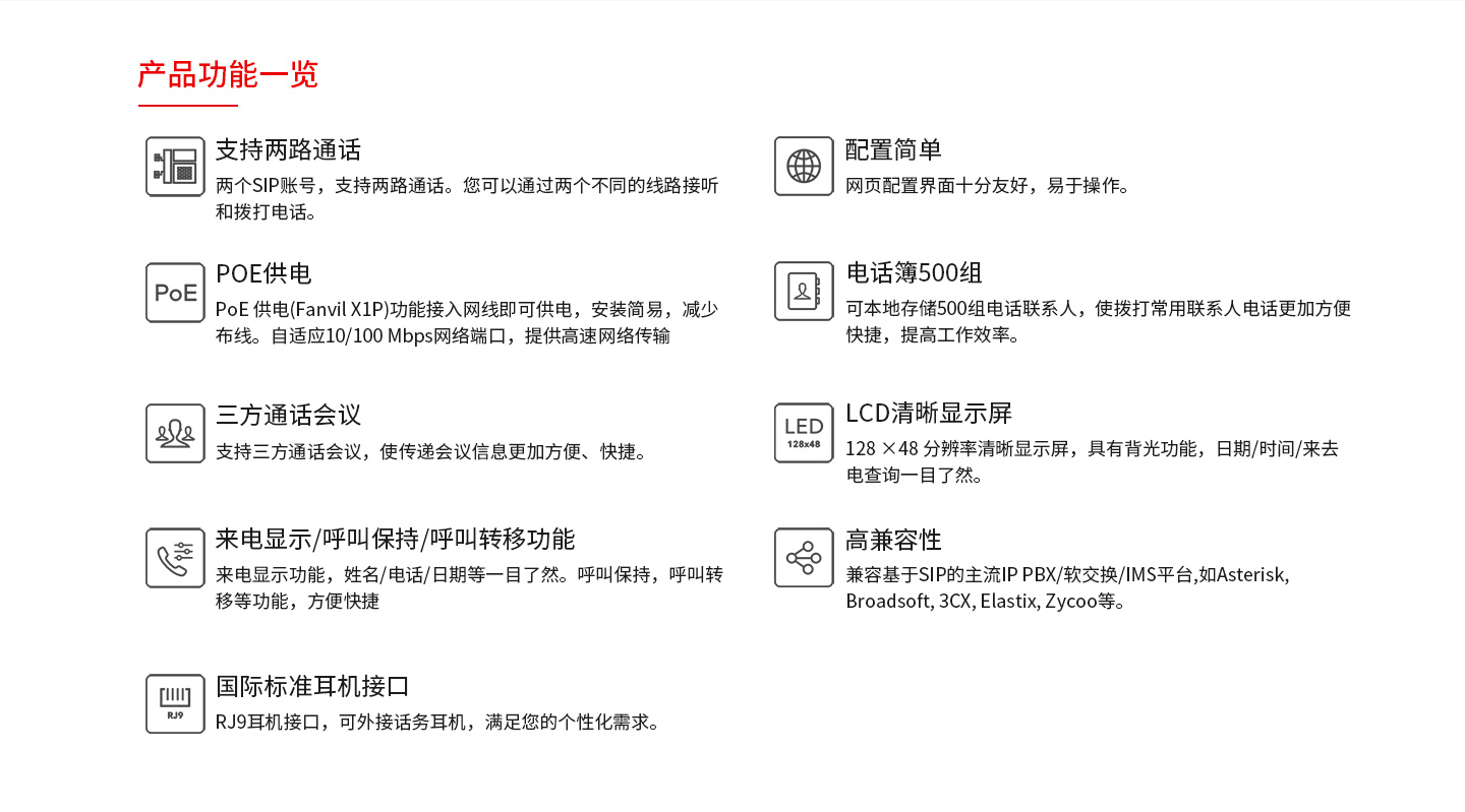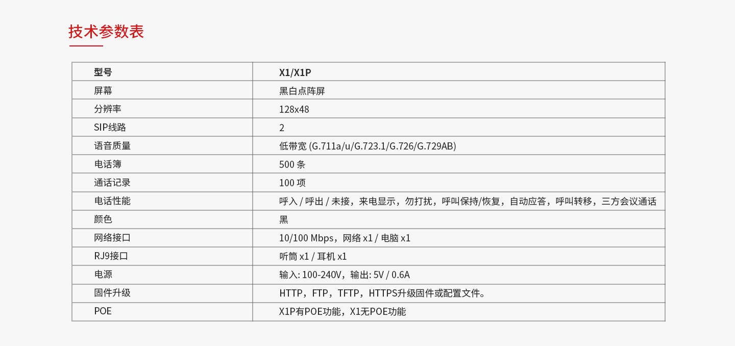 X1/X1P是方位入门级,高性价比的商务SIP话机。采用128 x48分辨率的黑白液晶屏,提供友好的用户界面。提供2个SIP账号,支持两路通话;支持POE供电(X1P),支持耳麦;支持三方电话会议的丰富功能;兼容主流的IP-PBX,易于安装,使用便捷,提高办公效率。