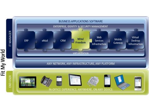 敏迪还根据当今IT业的发展趋势以及虚拟化技术的突飞猛进,结合Mitel自身产品的特点,提出的一个概念,“自由式架构”体系。这个体系可以自由地工作在任何网络基础设施上,可以让敏迪的呼叫控制软件MiVoice Business同所有敏迪增值应用服务完美地运行于虚拟化环境,自由地同各种其它商业应用共存,甚至相互集成,最终用户可以根据所处的环境场合自由地选择通讯工具,通讯手段,而且拥有完整统一流畅的用户体验。